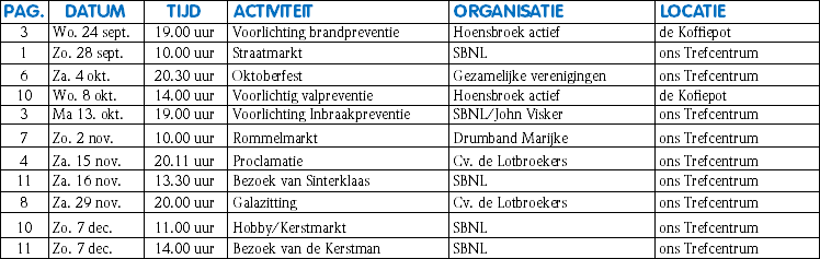 Hierboven staat een overzicht van de activiteiten zoals ze bij SBNL bekend zijn en in het buurtblad geplaatst worden. Het buurtblad is onder de tab Buurtblad te downloaden. Het is ook mogelijk om activiteiten door te geven om hier aan toe te voegen. Stuur in dat geval een email naar redactie.sbnl@outlook.nl of tik een bericht hierboven bij "Contact"